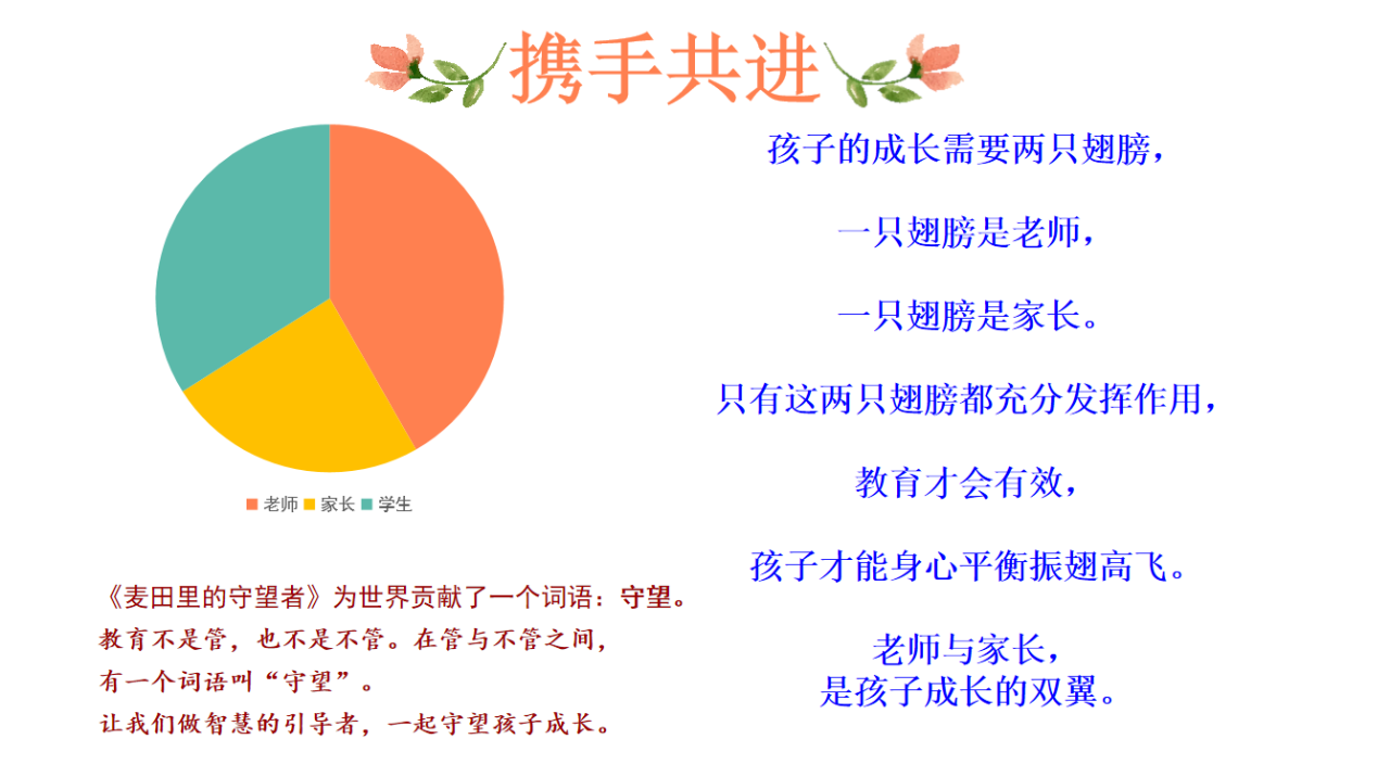 遇见,是故事的开始,携手,是温暖的篇章。这是一场家校共育的成长之约,这是一场爱与责任的双向奔赴。教育家苏霍姆林斯基曾说:“若只有学校而没有家庭,或只有家庭而没有学校,都不能单独地承担起塑造人的细致、复杂的任务。”